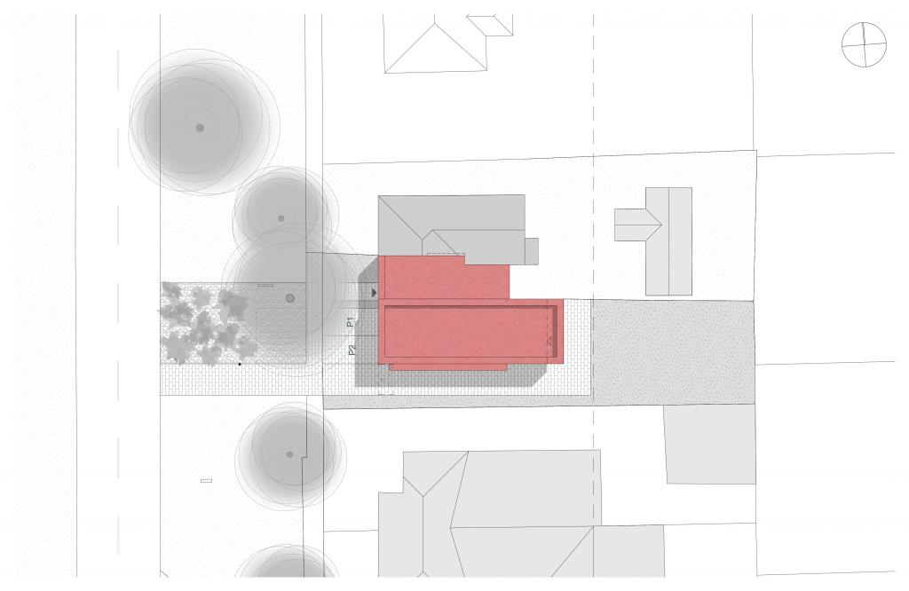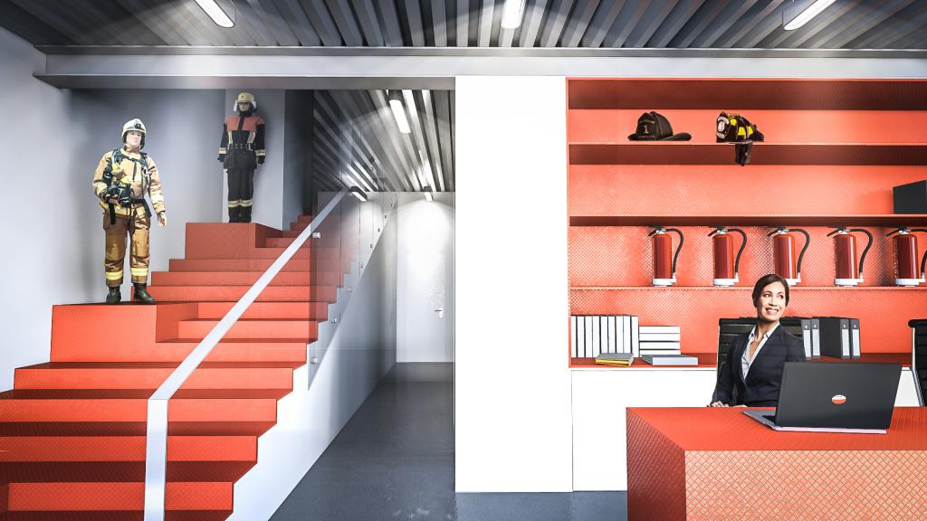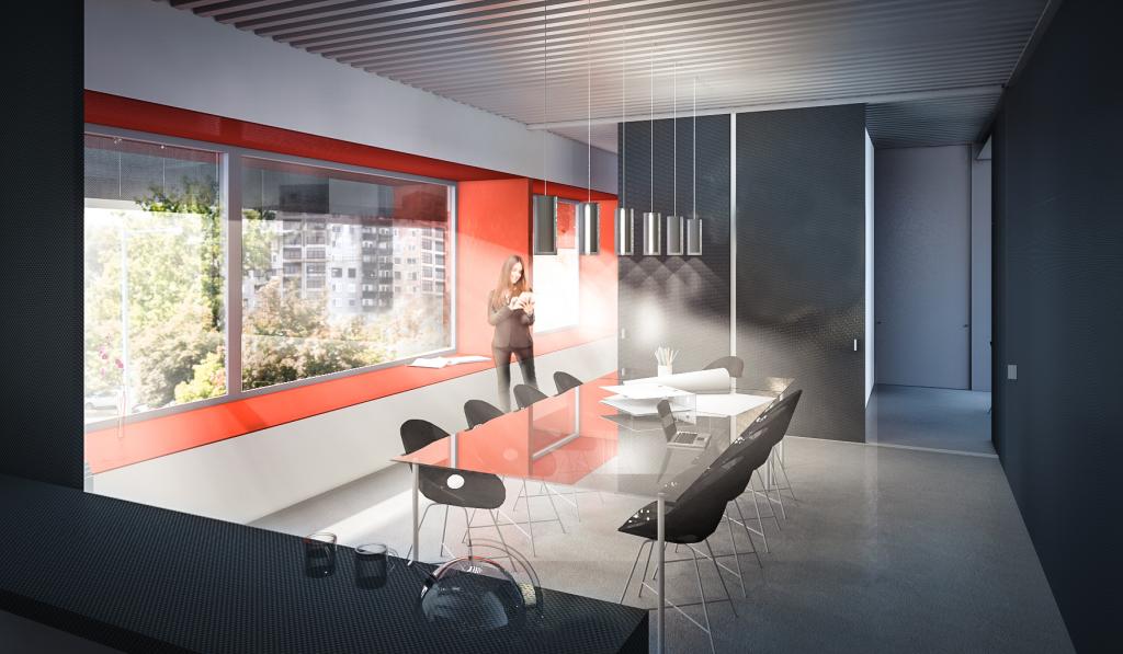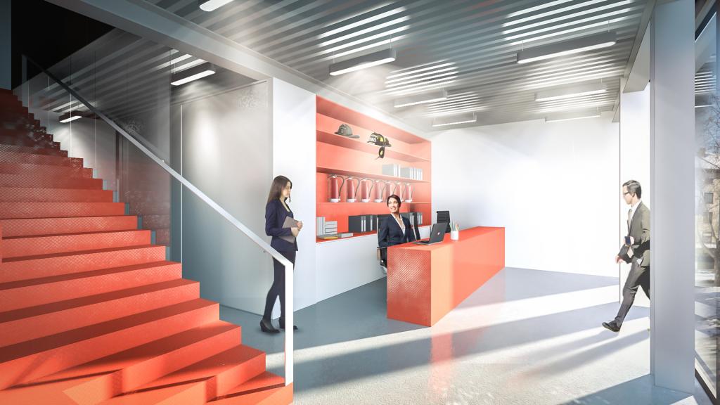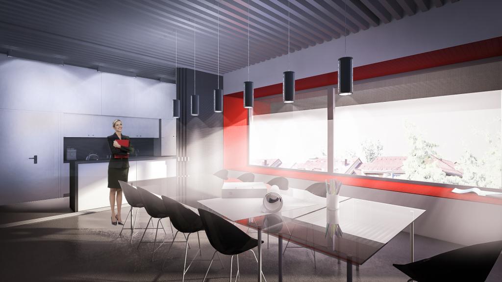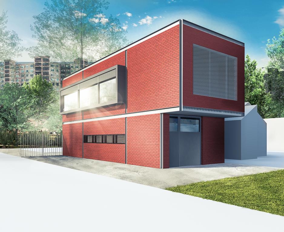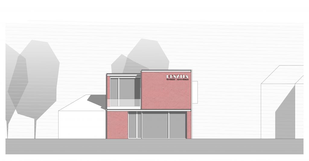 A tervezett épület valójában a jelenlegi működést folytatva, a telken kialakult nem optimális helyzetet felszámolva egy korszerű, minden igényét kielégítő, előremutató fejlesztés. A hátsó telekhatáron lévő műhely és a főépületben lévő funkciók egybemosásával immár 2 szinten működne. Az épület földszintjén történik a kereskedelem, a pulttal és üvegfallal elválasztott kiszolgálás. Itt kerül elhelyezésre a kereskedelmet kiszolgáló raktár és javítóműhelyek, a vizesblokk, valamint a takarítóeszköz tár. Az emeleten a lépcsőről érkezve központi tárgyalóba jutunk, melyből a kereskedelmet kiszolgáló irodák nyílnak. Tolófalakkal a teakonyha elválasztható, vagy elrejthető igény szerint. Ebből a térből nyílik a gépészet illetve a loggia.